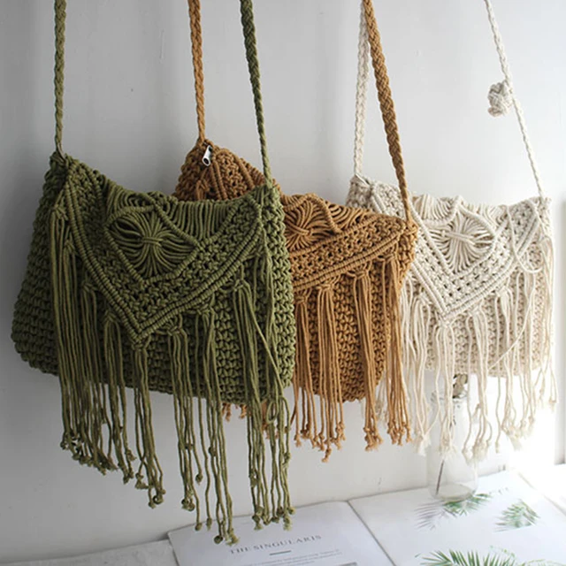 Handmade Cotton Woven Knitted Tassel Crossbody Bag Vintage Shoulder Messenger Bag Female Fashion Beach Summer Handbags for Women
